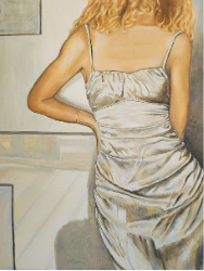 Satynowa suknia, delikatnie mieniąca się w świetle, podkreśla kobiecą sylwetkę, a jej faktura dodaje obrazowi zmysłowości i elegancji. Tło, niczym nierozpakowane płótno, staje się przestrzenią dla wyobraźni, gdzie każdy detal nabiera symbolicznego znaczenia. Obraz ten jest metaforą ludzkiej natury – każdy z nas jest takim nierozpakowanym płótnem, pełnym potencjału i tajemnic. Poznając drugiego człowieka, wpływamy na niego.